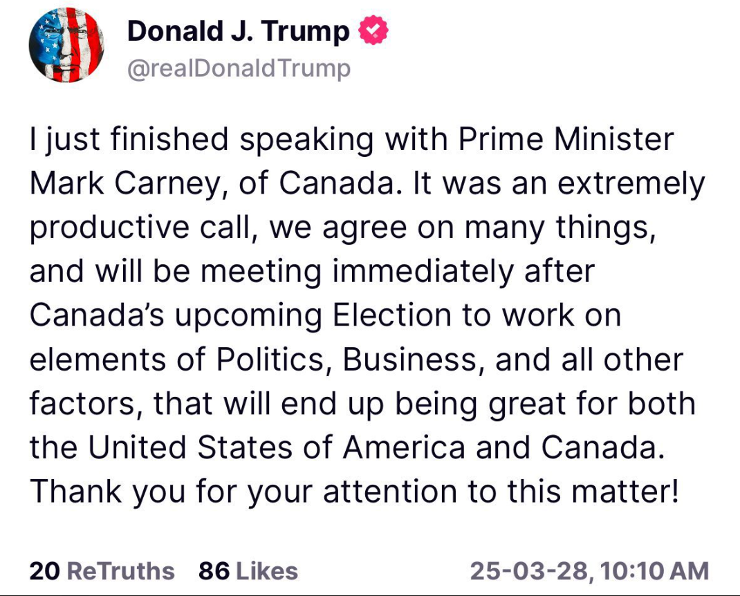 «Ήταν μια εξαιρετικά εποικοδομητική επικοινωνία, συμφωνούμε σε πολλά πράγματα και θα συναντηθούμε αμέσως μετά τις επερχόμενες εκλογές στον Καναδά για να εργαστούμε σε ζητήματα Πολιτικής, Επιχειρήσεων και όλων των άλλων ζητημάτων», έγραψε ο Τραμπ στο Truth Social.