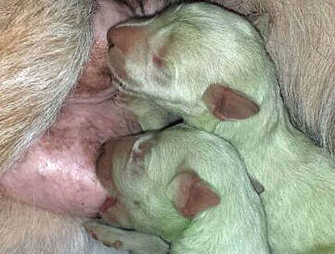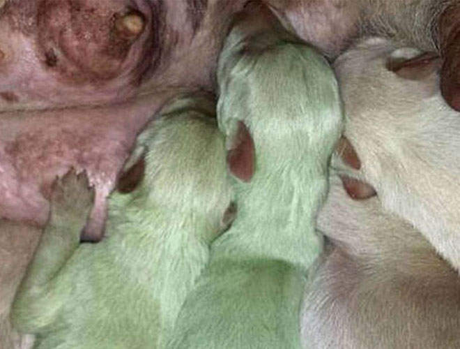 Άναυδη έμεινε η Ισπανή ιδιοκτήτρια μιας σκυλίτσας η οποία γέννησε μεταξύ άλλων και δύο …πράσινα κουταβάκια.«Δεν μπορούσα να το πιστέψω μόλις τα είδα. Θεώρησα αρχικά ότι τα κουτάβια ήταν βρώμικα και προσπάθησα να τα καθαρίσω, αλλά το χρώμα δεν έφευγε και συνειδητοποίησα πως αυτό ήταν το τρίχωμα τους» δήλωσε σε συνέντευξή της στον Independent η Άλντα Βαλεάδο Μολίνα, ιδιοκτήτρια των σπάνιων μικρών.