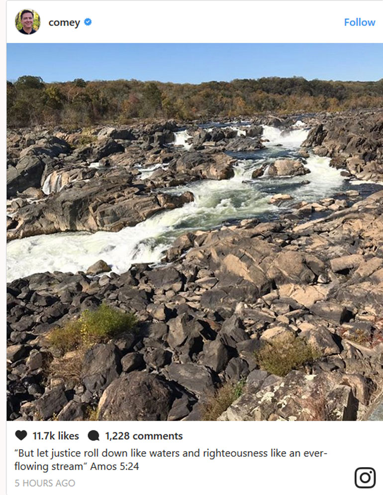 «Η δικαιοσύνη σας πρέπει να αναβλύζει όμως ρέει το νερό, να είναι πλούσια σαν χείμαρρος αδιάβατος» έγραψε ο Κόμεϊ στο Instagram αντιγράφοντας έναν στίχο από το Βιβλίο του προφήτη Αμώς. Συνόδευσε τη ρήση με τη φωτογραφία ενός καταρράκτη.