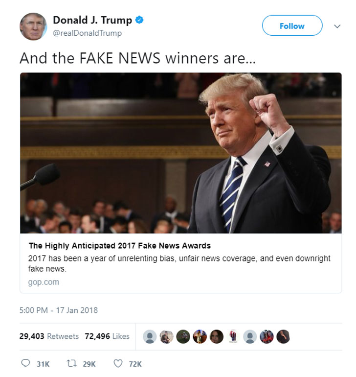 «Και οι νικητές των FAKE NEWS είναι…». Με το συνηθισμένο, εσκεμμένα προκλητικό στιλ του, ο μεγιστάνας ανήρτησε σε μήνυμά του στο Twitter έναν σύνδεσμο υπερκειμένου προς έναν άλλον ιστότοπο, που, σαν από ειρωνεία της τύχης, ήταν αδύνατο να προσπελαστεί για αρκετά λεπτά.