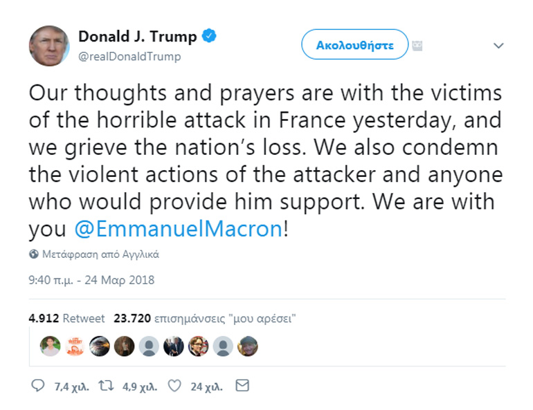 «Οι σκέψεις και οι προσευχές μας απευθύνονται στα θύματα της χθεσινής φρικτής επίθεσης στη Γαλλία και θρηνούμε για την απώλεια που υπέστη αυτό το έθνος. Είμαστε μαζί σας, Εμανουέλ Μακρόν», έγραψε στο Twitter ο Τραμπ.