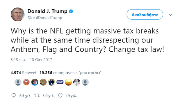 «Για ποιο λόγο η NFL χαίρει τόσο μεγάλων φοροαπαλλαγών, ενώ την ίδια ώρα δείχνει έλλειψη σεβασμού προς τον Εθνικό Ύμνο μας, τη Σημαία και το Έθνος; Αλλάξτε τη φορολογική νομοθεσία», έγραψε ο Τραμπ στο Twitter.