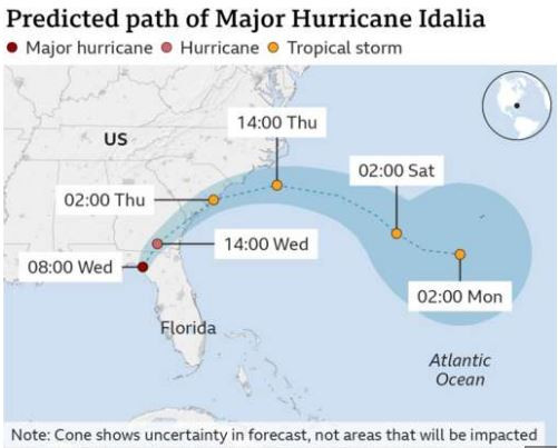 Ο Ιντάλια έφθασε στις ακτές της Φλόριντα ως τυφώνας κατηγορίας 3 με ανέμους που μπορεί να φθάσουν έως τα 205 χιλιόμετρα την ώρα, ανακοίνωσε το Εθνικό Κέντρο Τυφώνων (NHC) των ΗΠΑ.