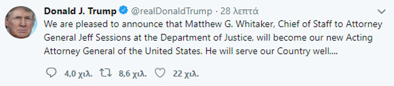 «Κατόπιν αιτήματός σας, υποβάλλω την παραίτησή μου», ανέφερε η σύντομη επιστολή του υπουργού Δικαιοσύνης Τζεφ Σέσιονς προς τον Αμερικανό πρόεδρο Ντόναλντ Τραμπ.