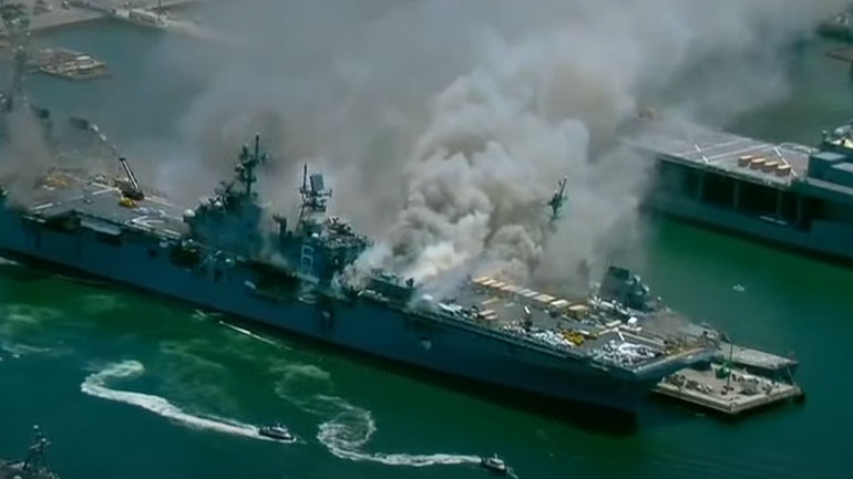 Στο βίντεο που είδε το φως της δημοσιότητας από το σημείο διακρίνονται πυροσβέστες να επιχειρούν κι ενώ πυκνός καπνός υψώνεται από το αμφίβιο πολεμικό πλοίο που είναι αγκυροβολημένο στη ναυτική βάση του Σαν Ντιέγκο.
