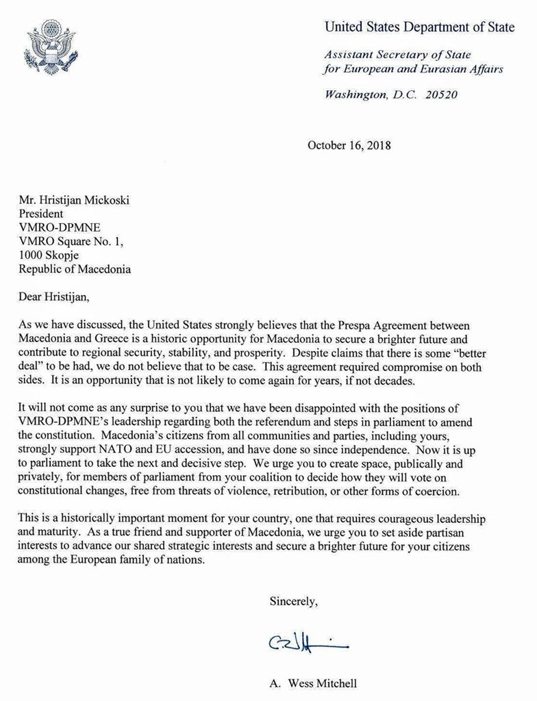 Σε επιστολή την οποία έστειλε στον Χρ. Μίτσκοσκι ο Aμερικανός διπλωμάτης μεταξύ άλλων επεσήμανε πως «από την σκοπιά των Ηνωμένων Πολιτειών δεν μπορεί να υπάρξει καλύτερη συμφωνία ανάμεσα στην ΠΓΔΜ και την Ελλάδα πέρα από την συμφωνία των Πρεσπών», την οποία χαρακτήρισε «ιστορική ευκαιρία» για το μέλλον της γειτονικής χώρας.