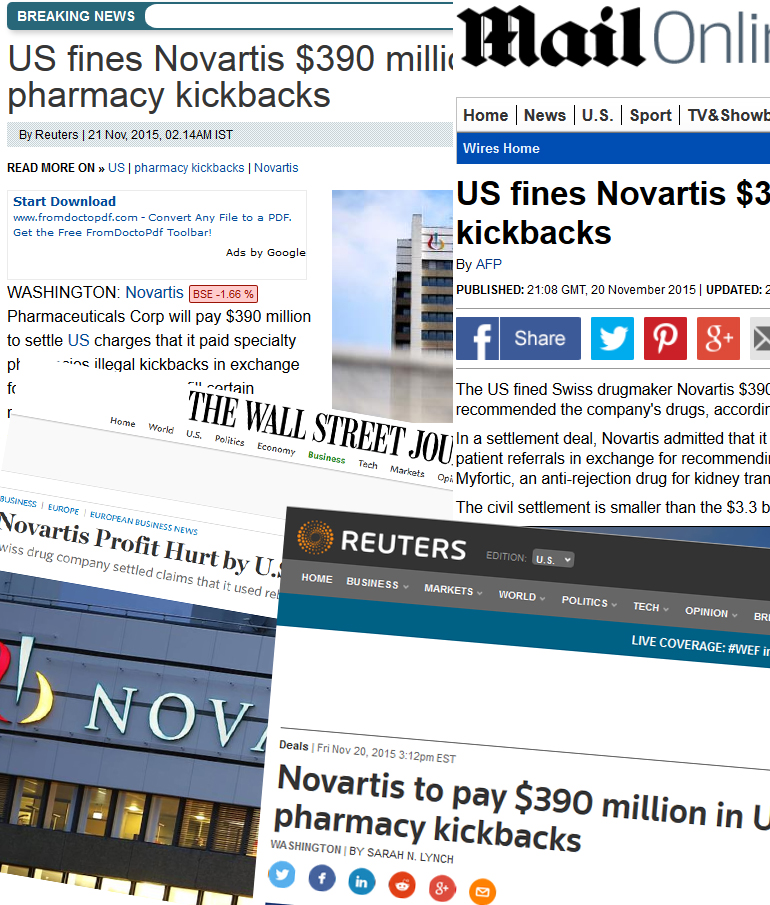 Έγγραφο που δόθηκε στη δημοσιότητα τον περασμένο Νοέμβριο αποκαλύπτει ότι οι ΗΠΑ επέβαλαν πρόστιμο στην ελβετική φαρμακοβιομηχανία Novartis ύψους 390 εκατομμυρίων δολαρίων με την κατηγορία ότι χορηγούσε μίζες σε όσα φαρμακεία συνιστούσαν σκευάσματα της εταιρείας.