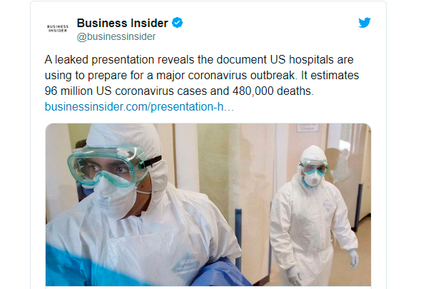 Σύμφωνα με το Business Insider, στην κατοχή του οποίου έχει περιέλθει το σχετικό έγγραφο με τις τρομακτικές εκτιμήσεις για την επιδημία, οι θάνατοι από τον Covid-19, και τις επιπλοκές του μπορεί να φτάσουν τις 480.000, ενώ συνολικά μπορεί να χρειαστούν νοσηλεία 4.800.000 άνθρωποι – κάτι που δύναται να φέρει στα όριά του το σύστημα υγείας της χώρας.