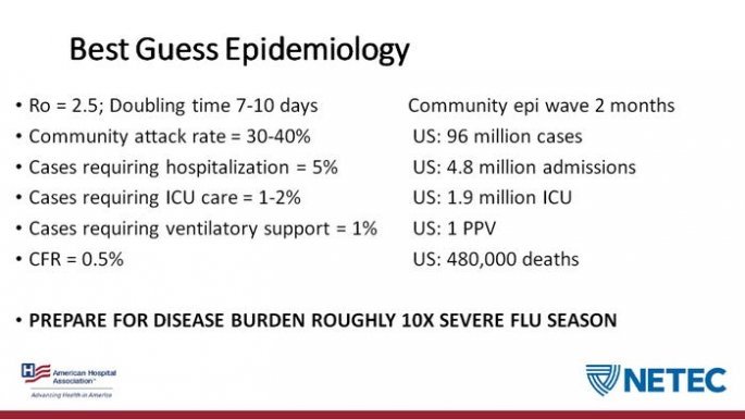Οι πλέον δυσοίωνες εκτιμήσεις για τη διάδοση του Covid-19,στις ΗΠΑ ανήκουν στον Δρ. Τζέιμς Λόλερ, καθηγητή στο Ιατρικό Κέντρο του Πανεπιστημίου της Νεμπράσκα και είναι αυτές που κάνουν λόγο για 480.000 θανάτους, 96 εκατομμύρια κρούσματα και 4,8 εκατομμύρια νοσηλείες. Ωστόσο, δεν δίνεται χρονικό εύρος εκδήλωσης των περιστατικών.