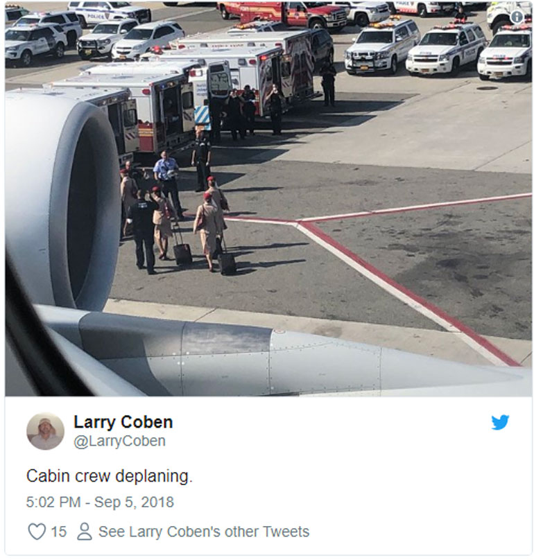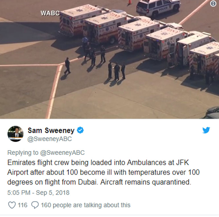 To Airbus A388 που εκτελούσε την πτήση ΕΚ203 από το Ντουμπάι για τη Νέα Υόρκη, μεταφέροντας 521 επιβάτες, προσγειώθηκε λίγα λεπτά μετά τις 9 το πρωί, τοπική ώρα (16.00 ώρα Ελλάδας). Πολλοί από τους επιβάτες ανέφεραν ότι αισθάνονταν αδιαθεσία και κάποιοι από αυτούς παρουσίαζαν συμπτώματα όπως βήχα και πυρετό, ανέφεραν τα Κέντρα Ελέγχου και Πρόληψης Ασθενειών (CDC) των ΗΠΑ.