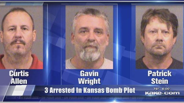 Οι τρεις άνδρες, ο Κέρτις Άλεν, 49 ετών, ο Γκάβιν Ράιτ, 49, και ο Πάτρικ Γιουτζίν Στάιν, 47, κατηγορούνται για συνωμοσία με σκοπό τη χρήση ενός όπλου μαζικής καταστροφής στο Γκάρντεν Σίτι του Κάνσας, ανέφερε ο Τομ Μπιλ, υπηρεσιακός ομοσπονδιακός εισαγγελέας της Περιφέρειας του Κάνσας, κατά τη διάρκεια συνέντευξης Τύπου στην Ουίτσιτα.
