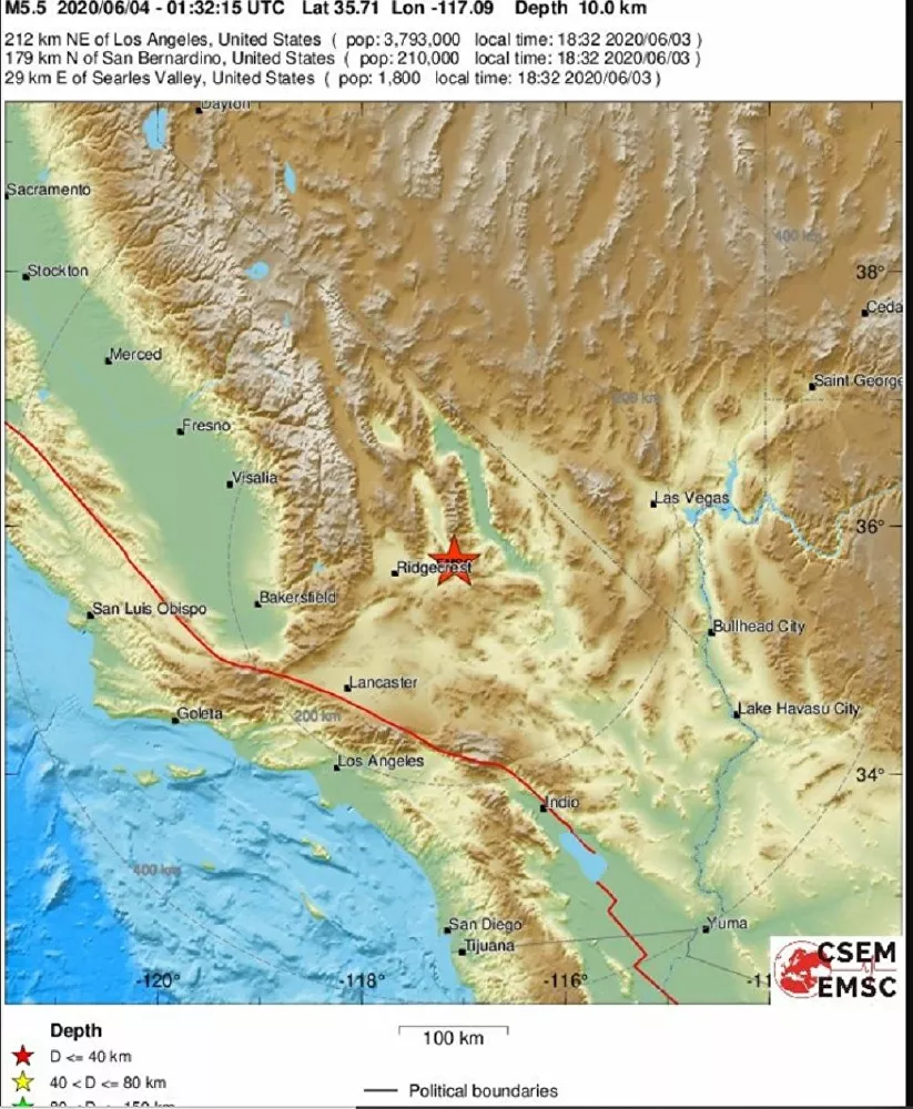 Το επίκεντρο του σεισμού, που σημειώθηκε στις 04.32 ώρα Ελλάδας, εντοπίστηκε σε απόσταση 210 χιλιομέτρων βορειοανατολικά του Λος Άντζελες και το εστιακό βάθος του ήταν 47 χιλιόμετρα.