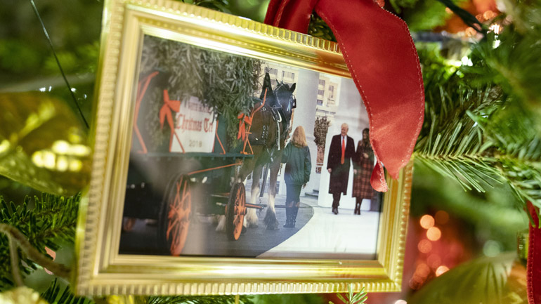 Οι Μπάιντεν έβαλαν ένα κάδρο με μια φωτογραφία του ζεύγους Τραμπ ανάμεσα στις φωτογραφίες άλλων προεδρικών οικογενειών που στολίζουν ένα από τα χριστουγεννιάτικα δέντρα τους. Από τη διακόσμηση αυτή δεν έλειψαν και ευχετήριες κάρτες που είχε υπογράψει ο Ντόναλντ Τραμπ.