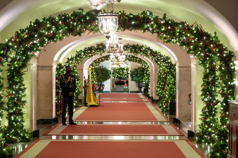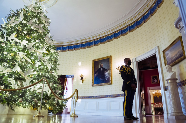 Κατά τη διάρκεια επίσκεψης τη Δευτέρα, οι δημοσιογράφοι διέσχισαν έναν Λευκό Οίκο πλούσια διακοσμημένο και φωταγωγημένο για τα Χριστούγεννα, σε παραδοσιακό στιλ. Είδαν ένα αντίγραφο του Λευκού Οίκου φτιαγμένο από μελόψωμο με μπαχαρικά, ένα τραπέζι στρωμένο για το εορταστικό γεύμα, κάλτσες με τα ονόματα των εγγονιών των Μπάιντεν…