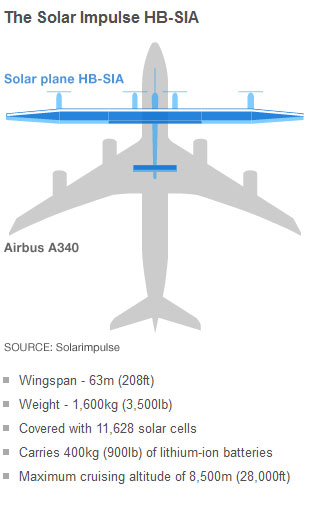 Το «Solar Impulse» απογειώθηκε από αεροδρόμιο στο βόρειο τμήμα της Καλιφόρνια των Η.Π.Α., με πρώτο προορισμό το Φοίνιξ. Έχοντας προσαρμοσμένες στα φτερά του περίπου 12.000 ενεργειακές κυψέλες, μπορεί να πραγματοποιεί πτήσεις, διάρκειας 24 ωρών. Η ηλιακή ενέργεια αποθηκεύεται σε μπαταρίες λιθίου, δίνοντας τη δυνατότητα στο αεροπλάνο και για νυχτερινές πτήσεις.
