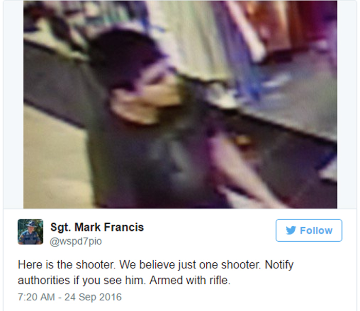 Σύμφωνα με τον Φράνσις, ο ύποπτος εθεάθη για τελευταία φορά να κατευθύνεται πεζός σε αυτοκινητόδρομο που περνά κοντά από το εμπορικό κέντρο. «Αναζητούμε τον ύποπτο και στοιχεία» είπε ο εκπρόσωπος της τροχαίας. «Εδώ είναι ο σκοπευτής. Πιστεύουμε ότι είναι μόνο ένας σκοπευτής. Ενημερώστε τις Αρχές αν τον δείτε. Είναι οπλισμένος με τουφέκι» έγραψε στο Twitter.