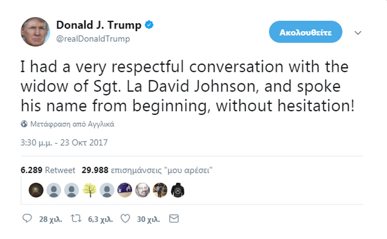 «Η βουλευτής των Δημοκρατικών επινόησε όσα ανέφερα στη σύζυγο ενός στρατιώτη που σκοτώθηκε στη μάχη (κι έχω αποδείξεις). Θλιβερό!» της είχε απαντήσει ο πρόεδρος στο Twitter.