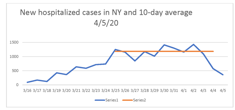 Από τις 25 Μαρτίου και μετά, τα μέτρα «Μένουμε σπίτι» καρποφόρησαν και για 10 μέρες από τότε τα καινούρια κρούσματα στη ΝΥ που χρειάζονταν νοσοκομείο παρέμειναν περίπου τα ίδια κάθε μέρα. Η πορτοκαλί γραμμή δείχνει τον μέσο όρο κρουσμάτων για αυτές τις δέκα μέρες. Και τα κρούσματα μειώθηκαν σημαντικά στις 5 και 6 Απριλίου. Δηλαδή είχαμε ένα «οροπέδιο» από 25 Μαρτίου έως τις 4 Απριλίου και στις 5 και 6 Απριλίου δύο σημαντικές μειώσεις, δηλαδή το ξεπέρασμα της κορυφής της καμπύλης. Αυτά είναι τα καλύτερα νέα που θα μπορούσαμε να έχουμε.