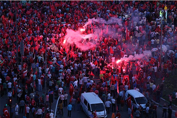 Ο επικεφαλής του τουρκικού κράτους είχε ζητήσει μέσω του Twitter στους συμπατριώτες του να «παραμείνουν στους δρόμους καθώς μια νέα έξαρση βίας είναι πιθανή» μετά την αποτυχημένη απόπειρα πραξικοπήματος με τουλάχιστον 265 νεκρούς.