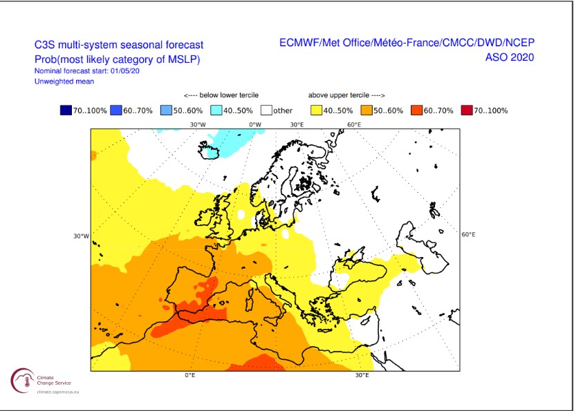 Σύμφωνα με το δημοσίευμα, οι επιστήμονες του Copernicus προβλέπουν με πιθανότητα μεγαλύτερη από 50% ότι τον Ιούλιο του 2020 οι θερμοκρασίες στην Ισπανία, τη Γαλλία και τμήματα της Ιταλίας θα είναι πολύ υψηλότερες από τον μέσο όρο.