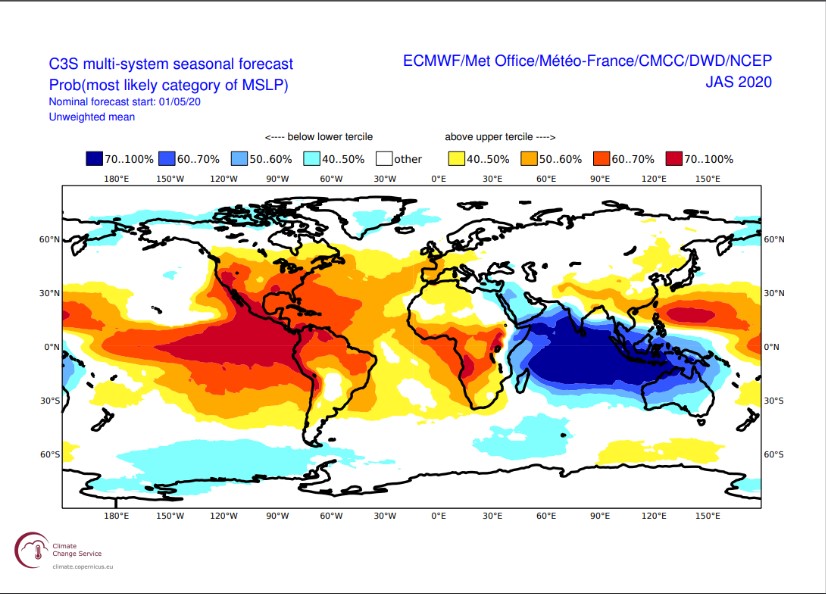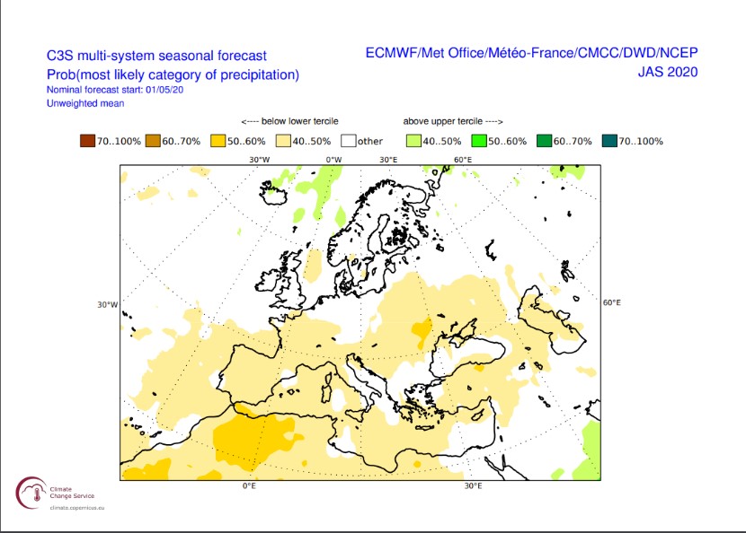 Προβλέπουν επίσης με περισσότερο από 40% πιθανότητα ότι το καλοκαίρι του 2020 οι βροχοπτώσεις σε περιοχές της Κεντρικής Ευρώπης, της Γαλλίας και της Ισπανίας θα είναι πολύ χαμηλότερες από τις κανονικές.