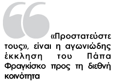 «Προστατεύστε τους», είναι η αγωνιώδης έκκληση που έρχεται από τον προκαθήμενο της Ρωμαιοκαθολικής Εκκλησίας Πάπα Φραγκίσκο προς τη διεθνή κοινότητα. Ο ποντίφικας απευθύνει έκκληση να σταματήσει το «ανθρωπιστικό δράμα που βρίσκεται σε εξέλιξη», να προστατευθούν όσοι απειλούνται από τη βία και να εξασφαλιστεί βοήθεια για τους εκτοπισμένους.