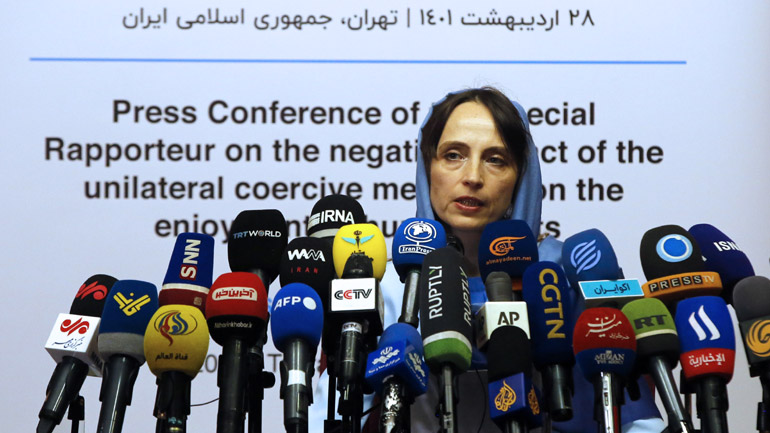 Η ειδική εισηγήτρια των Ηνωμένων Εθνών για τον αρνητικό αντίκτυπο των μονομερών μέτρων εξαναγκασμού στα ανθρώπινα δικαιώματα, η Λευκορωσίδα καθηγήτρια του διεθνούς δικαίου Αλένα Νταουγκάν, δήλωσε πως διαπίστωσε τις «καταστροφικές» συνέπειες των αμερικανικών κυρώσεων στο Ιράν χθες Τετάρτη, κατά την ολοκλήρωση δωδεκαήμερης επίσκεψής της στην Ισλαμική Δημοκρατία.