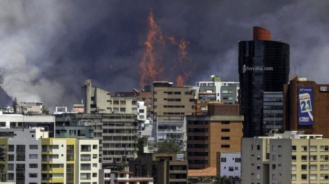 Αποπνικτική είναι η ατμόσφαιρα στην πρωτεύουσα του Εκουαδόρ, καθώς πυκνός μαύρος καπνός έχει καλύψει τμήματα της πόλης.