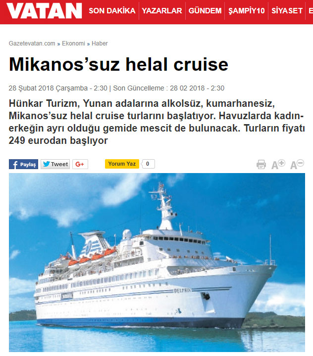 Οι Τούρκοι, λοιπόν, αποφάσισαν να οργανώνουν πλέον ειδικές κρουαζιέρες στο Αιγαίο με αφετηρία το λιμάνι του Τσεσμέ, δίπλα από τη Σμύρνη και απέναντι από τη Χίο, όπου και ανακοινώθηκε το project. Οι κρουαζιέρες αυτές ονομάζονται Halal που σημαίνει «ευλογημένο», σε αντίθεση με το Haram που σημαίνει «καταραμένο». Έτσι λοιπόν από τον Ιούνιο εγκαινιάζονται ειδικές κρουαζιέρες «ισλαμικού χαρακτήρα», με πλοία τα οποία θα διαθέτουν ξεχωριστές πισίνες για άνδρες και γυναίκες, όπου θα υπάρχει μικρό τζαμί για την προσευχή και βεβαίως δεν θα υφίσταται ίχνος δραστηριότητας που να παραπέμπει σε τζόγο. Το αλκοόλ, βεβαίως, θα είναι απαγορευμένο. Οι τουριστικοί προορισμοί που εξαγγέλθηκαν είναι η Κρήτη, το Ναύπλιο, η Αθήνα, η Ρόδος, η Σαντορίνη, η Λέσβος και η Χίος.