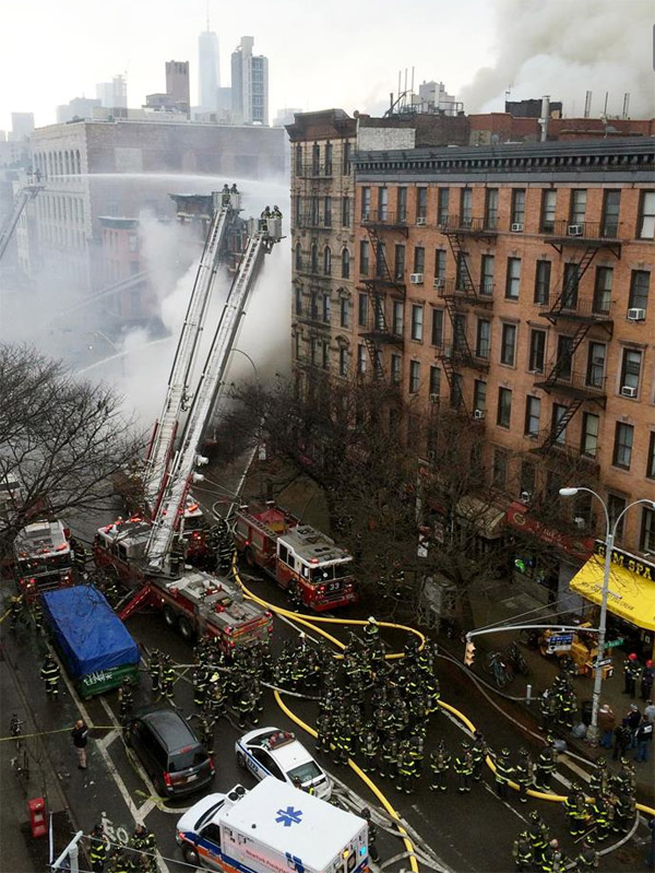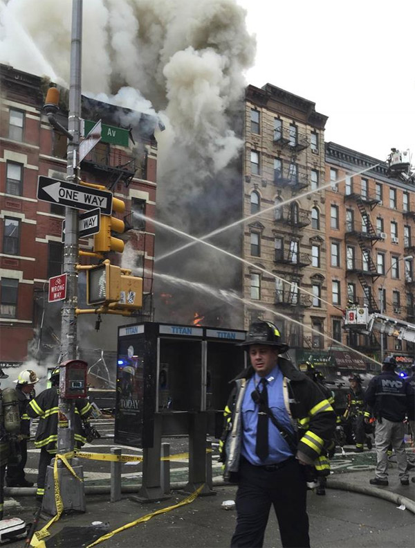 Ένα ολόκληρο κτήριο ισοπεδώθηκε στο Μανχάταν, έπειτα από ισχυρή έκρηξη και φωτιά στην περιοχή στο Ίστ Βίλατζ το μεσημέρι της Πέμπτης. Ο αριθμός των τραυματιών ανήλθε στους 13 εκ των οποίων τα τρία μεταφέρθηκαν σε νοσοκομείο με σοβαρά εγκαύματα. Οι πρώτες εικόνες που έρχονται από το Μανχάταν εμφανίζουν το κτήριο παραδομένο στις φλόγες, ενώ στη συνέχεια καταρρέει.