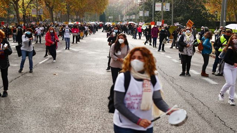 Χορεύοντας και χτυπώντας τύμπανα στον δρόμο, γιατροί και νοσηλευτές διαμαρτυρήθηκαν σήμερα στη Μαδρίτη για τις περικοπές στον τομέα της Υγείας που, όπως λένε, τους έχουν αφήσει να παλεύουν για να αντιμετωπίσουν την πανδημία της Covid-19.