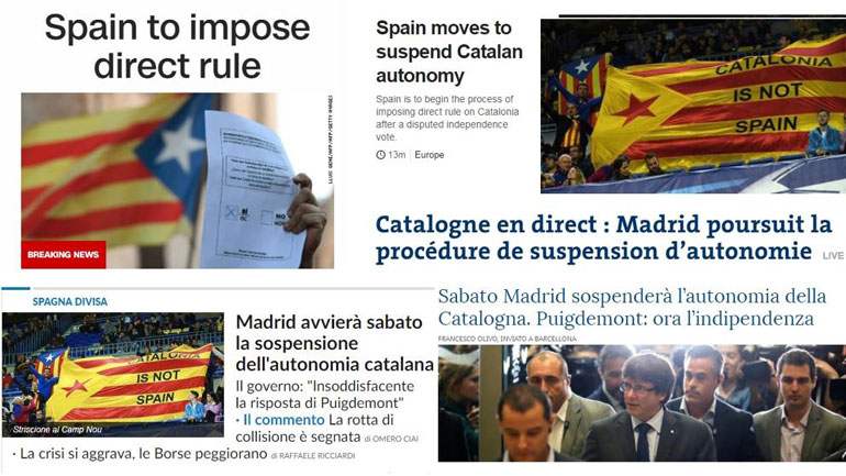 Νωρίτερα, η καταλανική εφημερίδα Vanguardia επεσήμαινε την «ιστορική ευθύνη» του Κάρλες Πουτζντεμόν, παρακινώντας τον να επιλέξει την οδό που του πρότεινε η κυβέρνηση από χθες: προκήρυξη πρόωρων τοπικών εκλογών για μία εκκίνηση εκ του μηδενός. «Δεν υπάρχει αξιοπρέπεια στη συλλογική αυτοκτονία, κυρίως εάν αυτόν αποτελεί απόφαση ενός, ενώ όλοι υποφέρουν», γράφει η εφημερίδα της Καταλονίας.