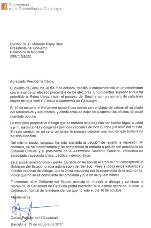 «Εάν η κυβέρνηση του Κράτους επιμείνει στην παρεμπόδιση του διαλόγου και συνεχίσει την καταστολή, το Κοινοβούλιο της Καταλονίας θα έχει τη δυνατότητα να προχωρήσει, εάν το θεωρεί προσήκον, στην ψήφιση μίας επίσημης διακήρυξης της ανεξαρτησίας την οποία δεν ψήφισε στις 10 Οκτωβρίου», αναφέρει σχετικά στην αμφίσημη επιστολή που έστειλε στον Μαριάνο Ραχόι.