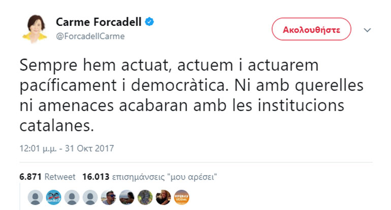 «Ούτε οι διώξεις ούτε οι απειλές δεν θα θέσουν εμπόδια στους καταλανικούς θεσμούς» έγραψε στο Twitter η Φορκαντέλ, δηλώνοντας ότι η συμπεριφορά της θα είναι «ειρηνική και δημοκρατική».