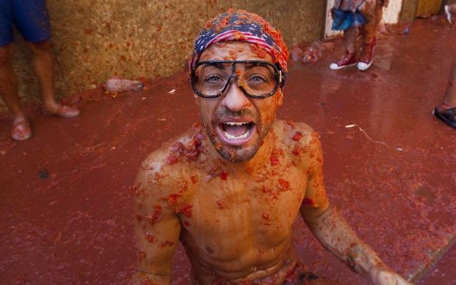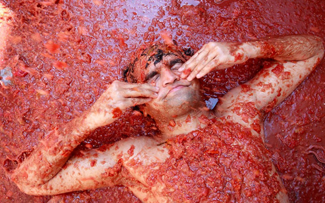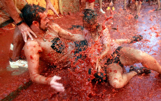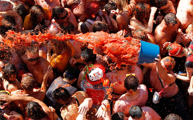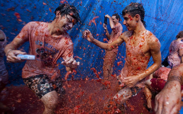 Τα φορτηγά με τους 120 τόνους ντομάτας βρίσκονταν εδώ και ημέρες στις θέσεις τους για το ετήσιο φεστιβάλ «Λα Τοματίνα», με τους περίπου 50.000 τουρίστες να ενώνονται με τους ντόπιους, αρχίζοντας να πετούν ο ένας στον άλλο… ντομάτες.