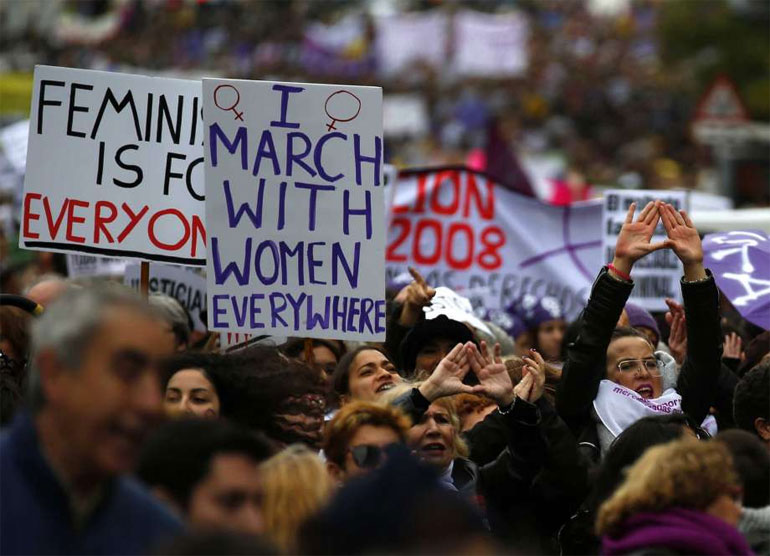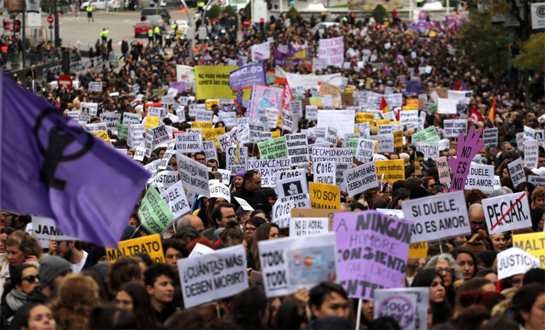 Δεκάδες χιλιάδες διαδηλωτές, με αρκετούς από αυτούς να φορούν ρούχα σε αποχρώσεις του μοβ διαδήλωσαν σήμερα στη Μαδρίτη, αλλά κι άλλες ισπανικές πόλεις για τον εορτασμό της Διεθνούς Ημέρας Εξάλειψης της Βίας Κατά των Γυναικών.
