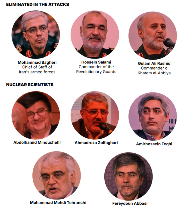Η Daily Mail δημοσίευσε φωτογραφίες των ανώτατων στρατιωτικών στελεχών και κάποιων από τους πυρηνικούς επιστήμονες που σκοτώθηκαν κατά την ισραηλινή επίθεση.