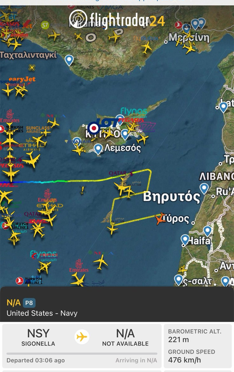 Αυτή τη στιγμή στρατιωτικό αεροσκάφος προεχόμενο απο την αμερικανική βάση Σιγκονέλα της Σικελίας επιτηρεί τα χωρικά ύδατα του Ισραήλ.