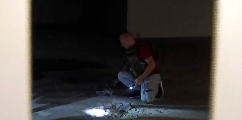 Όπως καταγράφει η κάμερα, πυροτεχνουργός, πάνω από τον κρατήρα που άνοιξε η ρουκέτα, εξετάζει τον προωθητικό μηχανισμό της. Δεν πιάνει τίποτε με τα χέρια του. Με ένα μαχαίρι εξετάζει τα υπολείμματα της ρουκέτας. Ισχυρές αστυνομικές δυνάμεις και στρατιώτες έφτασαν αμέσως στο σημείο.