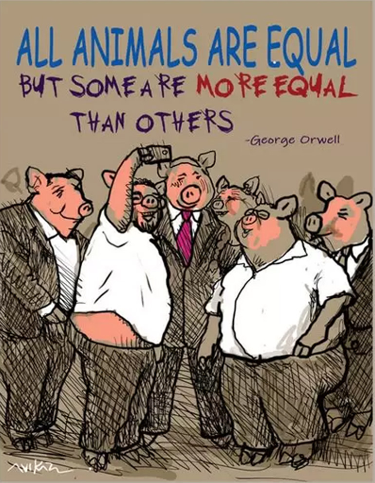Το σκίτσο συνοδευόταν από τη λεζάντα: «Όλα τα ζώα είναι ίσα, αλλά μερικά ζώα είναι πιο ίσα από τα άλλα», τη γνωστή φράση από το βιβλίο του Τζορτζ Όργουελ «Η Φάρμα των Ζώων».