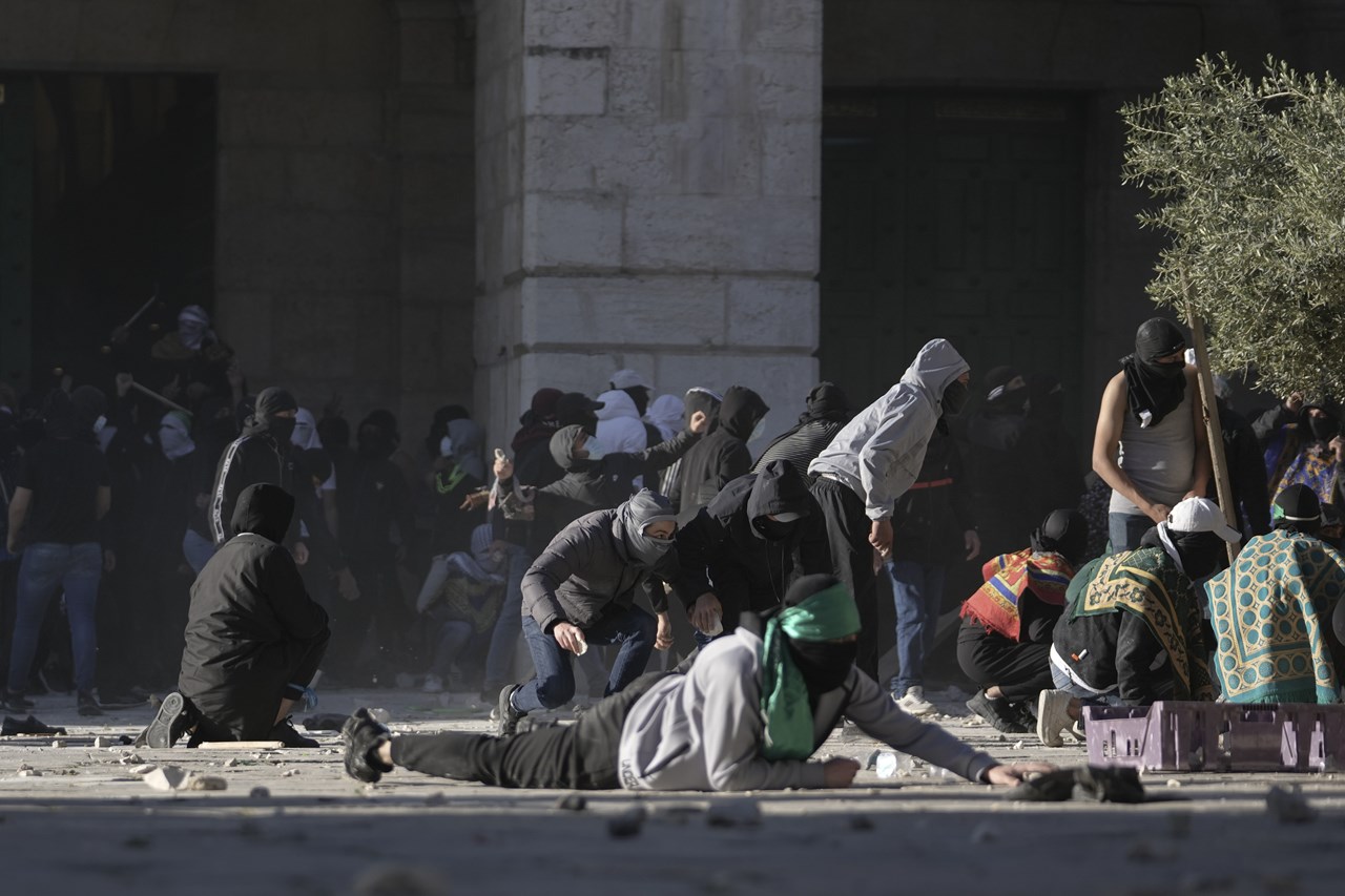 Η αστυνομία ανακοίνωσε ότι Παλαιστίνιοι άρχισαν να πετούν πέτρες και φωτοβολίδες, ενώ εκτίμησε σε 100 τους ταραξίες μεταξύ 12.000 πιστών.