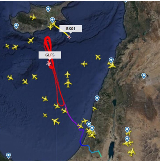 Την Τετάρτη, από το πρωί και για τουλάχιστον τέσσερις ώρες, εξελιγμένο κατασκοπευτικό αεροσκάφος του Ισραήλ πετούσε σε μεγάλο ύψος νότια της ΚύπρουΤο υπερσύχρονο Gulfstream G550, πετώντας σε πολύ μεγάλο ύψος (43.000 ποδών), πραγματοποίησε τουλάχιστον 10 γύρους της περιοχής.