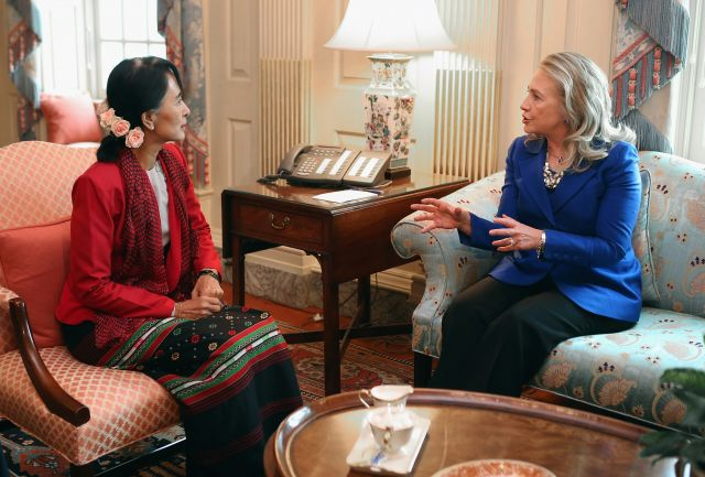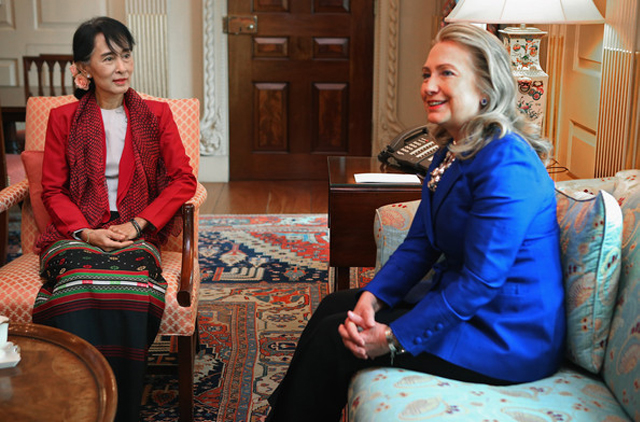 Η  Aung San Suu Kyi έφθασε στις Η.Π.Α. τη Δευτέρα και μια ημέρα μετά, την Τρίτη, συναντήθηκε με την υπουργό Εξωτερικών της χώρας, Hillary Clinton, με τις μεταξύ τους συζητήσεις να διεξάγονται μέσα σε εγκάρδιο κλίμα.