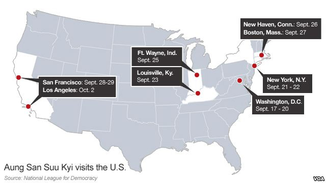 Στη διάρκεια παραμονής της στις Η.Π.Α. η Aung San Suu Kyi θα έχει συνάντηση και με τον πρόεδρο των Η.Π.Α., Barack Obama, ενώ θα λάβει μια σειρά από τιμητικές διακρίσεις, συμπεριλαμβανομένης αυτής του Χρυσού Μεταλλίου του Κογκρέσου, της ύψιστης τιμής για Αμερικανό πολίτη. Παράλληλα, θα έχει επαφές με ακτιβιστικές οργανώσεις καθώς και με ομάδες οικονομικών μεταναστών από τη Μιανμάρ που ζουν και εργάζονται πλέον στις Η.Π.Α., με κυριότερη αυτή στην πολιτεία της Ιντιάνα.