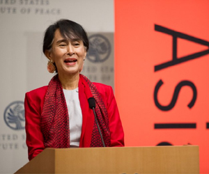 Νωρίτερα, η εμβληματική μορφή της Αντιπολίτευσης στη Μιανμάρ έδωσε το παρών σε ειδική εκδήλωση που διοργανώθηκε προς τιμήν της από το Αμερικανικό Ινστιτούτο για την Ειρήνη.