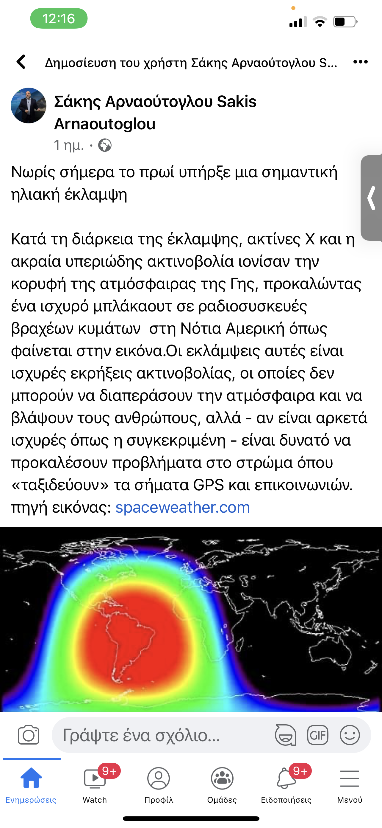 Μια ισχυρή ηλιακή έκλαμψη σημειώθηκε το πρωί της Παρασκευής. Σύμφωνα με τον Σάκη Αρναούτογλου, κατά τη διάρκεια της έκλαμψης, ακτίνες Χ και η ακραία υπεριώδης ακτινοβολία ιονίσαν την κορυφή της ατμόσφαιρας της Γης, προκαλώντας ένα ισχυρό μπλάκαουτ σε ραδιοσυσκευές βραχέων κυμάτων στη Νότια Αμερική.