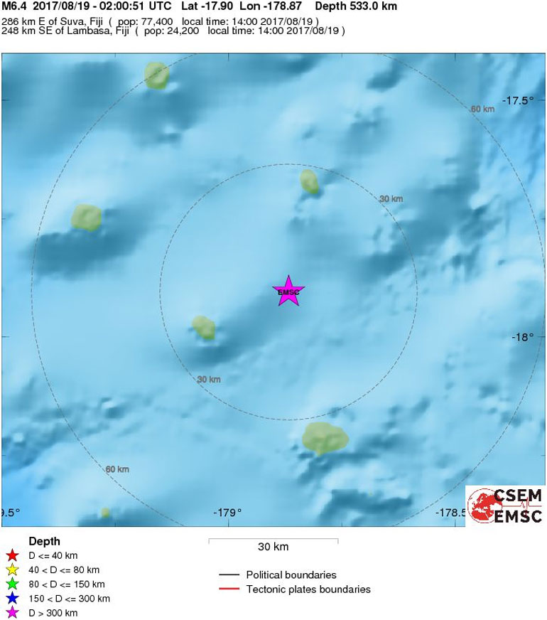Ισχυρή σεισμική δόνηση 6,4 βαθμών της κλίμακας Ρίχτερ σημειώθηκε στις 05.00 τα ξημερώματα του Σαββάτου, ώρα Ελλάδας, στο νησιωτικό σύμπλεγμα Φίτζι.
