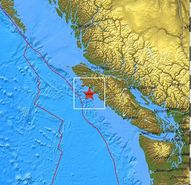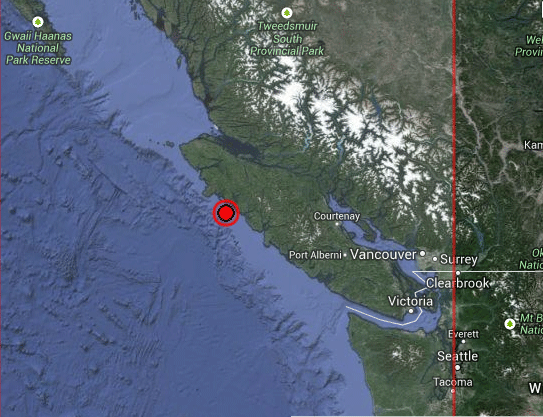 Το επίκεντρο του σεισμού εντοπίστηκε 317 χλμ. δυτικά του Βανκούβερ εντός των διοικητικών ορίων της επαρχίας Βρετανική Κολούμπια. Το εστιακό βάθος μετρήθηκε στα 8 χλμ..