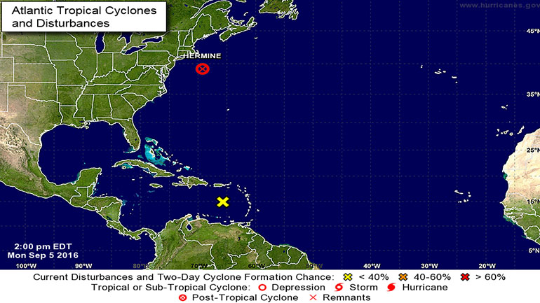 Η Ερμιόνη παρασύρεται προς το βορρά και αυτή τη στιγμή απέχει 305 μίλια από το ανατολικό άκρο του Λονγκ Άιλαντ ενώ «θα ελίσσεται από τα μέσα του Ατλαντικού προς νότιες κατευθύνσεις από αύριο κι έπειτα, έως και την Πέμπτη οπότε και το τροπικό κύμα αναμένεται να φτάσει ανοικτά του Πουέρτο Ρίκο και της Ισπανιόλα», σύμφωνα με την Εθνική Μετεωρολογική Υπηρεσία.