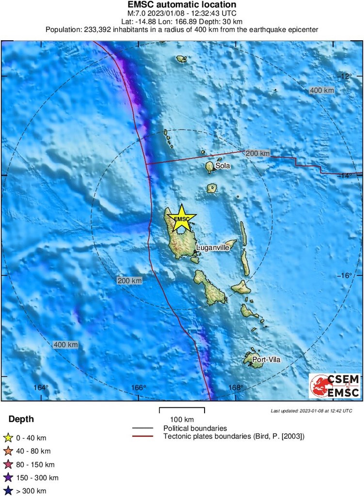 Following the #earthquake M6.9 occurred 28 km NW of #Port-Olry (#Vanuatu) 13 min ago (local time 23:32:42). Move away from the coast and reach a higher place. Follow national authorities’ directives. Updates at the links provided below pic.twitter.com/IPdiBbBo2s— EMSC (@LastQuake) January 8, 2023